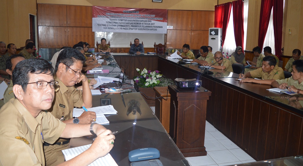 Kuala Kapuas,GK – Dinas Penanaman Modal dan Perizinan Terpadu Satu Pintu (DPMPTSP) Kabupaten Kapuas melaksanakan Sosialisasi Peraturan Bupati Kapuas Nomor 14 Tahun 2017 Tentang Pelimpahan Kewenangan Perizinan dan Non Perizinan kepada DPMPTSP Kabupaten Kapuas dan Peraturan Bupati Kapuas Nomor 15 Tahun 2017 Tentang Standar Operasional Prosedur Pelayanan Perizinan dan Nonperizinan Pada DPMPTSP Kabupaten Kapuas. Kegiatan sosialisasi yang digelar pada hari Selasa (13/6) yang lalu itu dipimpin oleh Sekertaris Daerah Kabupaten Kapuas Rianova SH dan dihadiri oleh Plt Kepala Dinas PMPTSP Kabupaten Kapuas Septedy, Camat se Kabupaten Kapuas dan Kepala SOPD di lingkup Pemkab Kapuas.