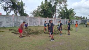 FOTO : Prajurit Korem 102/Pjg dan Yonif Raider 631/Atg saat melaksanakan kegiatan gotong royong membersihkan lingkungan stadion mini UPR, Senin (11/07/2022) pagi.