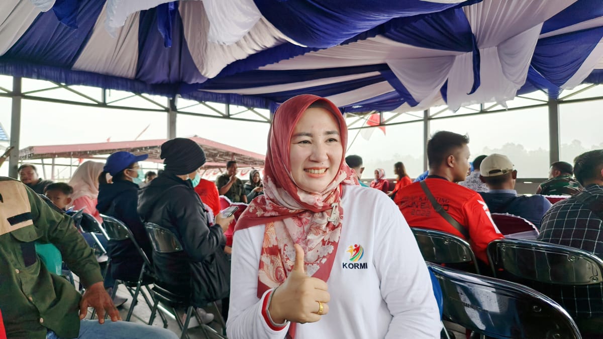 FOTO : Ketua KORMI Kabupaten Katingan, Endang Susilawatie saat menyaksikan jalan olahraga balap Katinting di Desa Baun Bango, Kecamatan Kamipang.