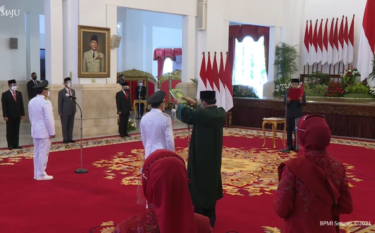 FOTO : Presiden RI, Ir. H. Joko Widodo saat melantik H. Sugianto Sabran dan H. Edy Pratowo, S.Sos., M.M sebagai Gubernur dan Wakil Gubernur Kalteng masa jabatan 2021-2024 di Istana Negara Jakarta, Selasa (25/5/2021). KALTENGNEWS.co.id – Palangka Raya – Presiden Republik Indonesia (RI) Ir. H. Joko Widodo lantik pasangan Gubernur dan Wakil Gubernur Kalimantan Tengah, H. Sugianto Sabran dan H. …