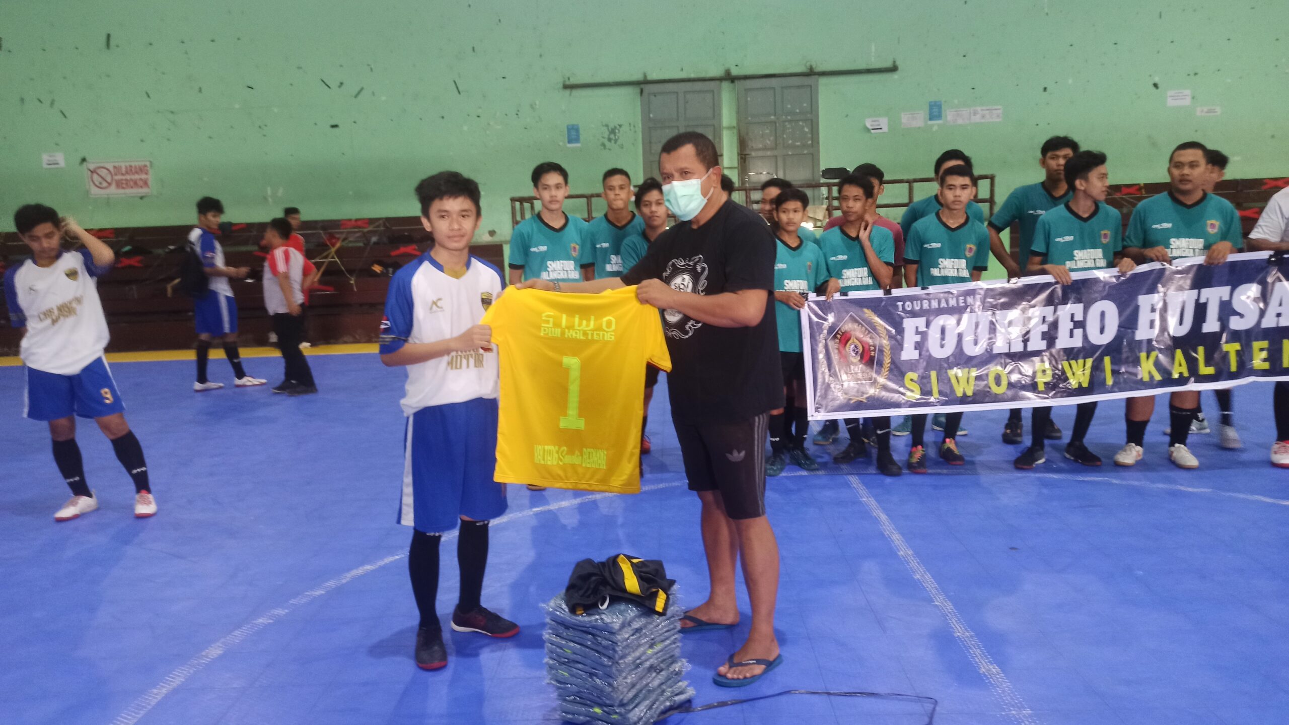 FOTO : Sekretaris SIWO PWI Kalteng, Indar Saksena saat menyerahkan bantuan kaos tim untuk tim CKB Naufal dan SMA 4 usai ajang fourfeo SIWO Kalteng di GOR KONI, Palangka Raya Sabtu (13/11/2021). KALTENGNEWS.co.id – PALANGKA RAYA – Persatuan Wartawan Indonesia (PWI) Provinsi Kalimantan Tengah (Kalteng) melalui Seksi Wartawan Olahraga (SIWO) giatkan sparing partner pertandingan cabang olahraga futsal dengan sistem fourfeo …